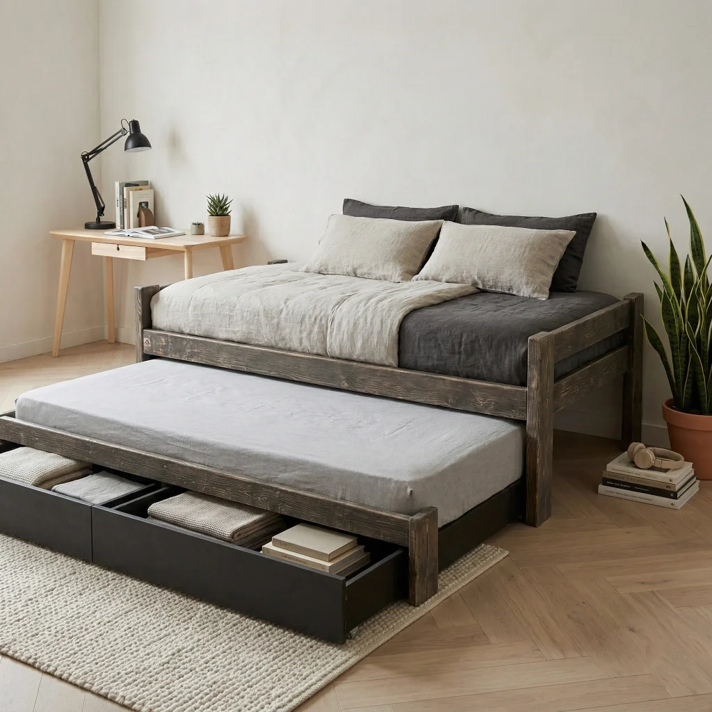 Na rozdíl od levných postelí z dřevotřísky nebo MDF nabízí masivní dřevo přirozenou krásu a odolnost, která vydrží desítky let. Kartáčovaný povrch zachovává strukturu dřeva, je snadno udržovatelný a odolný vůči každodennímu opotřebení. Rozkládací konstrukce přitom šetří místo – v jedné posteli máte vždy připraveno lůžko pro nečekanou návštěvu.