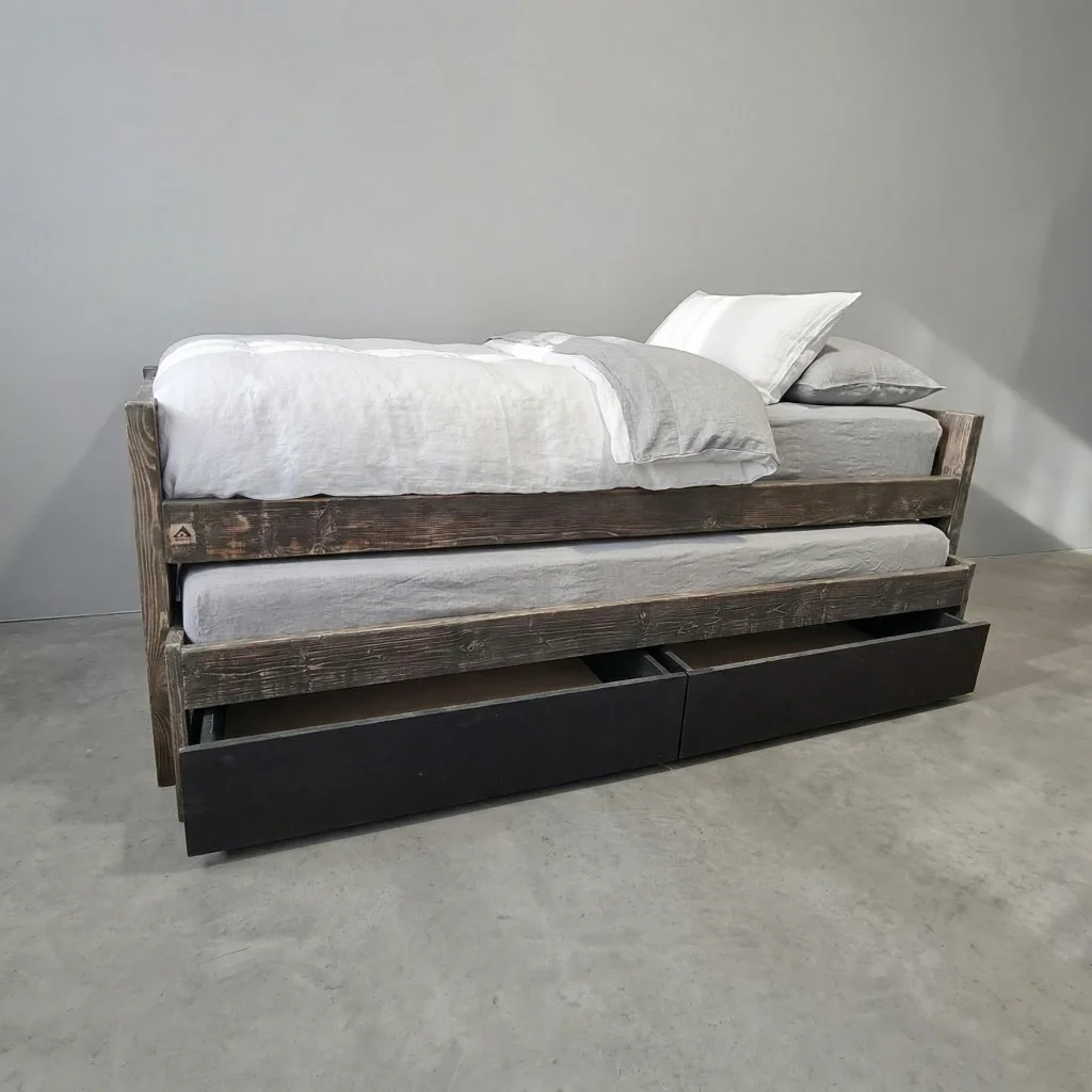 Masivní rozkládací postel s výsuvným lůžkem pro hosty nebo děti. Kartáčované dřevo (buk, dub nebo smrk) s lakovým povrchem. Rozměry 80×200, 90×200 nebo 120×200 cm – možnost šuplíků nebo zvedacího roštu. Vyrábíme na míru v České republice.